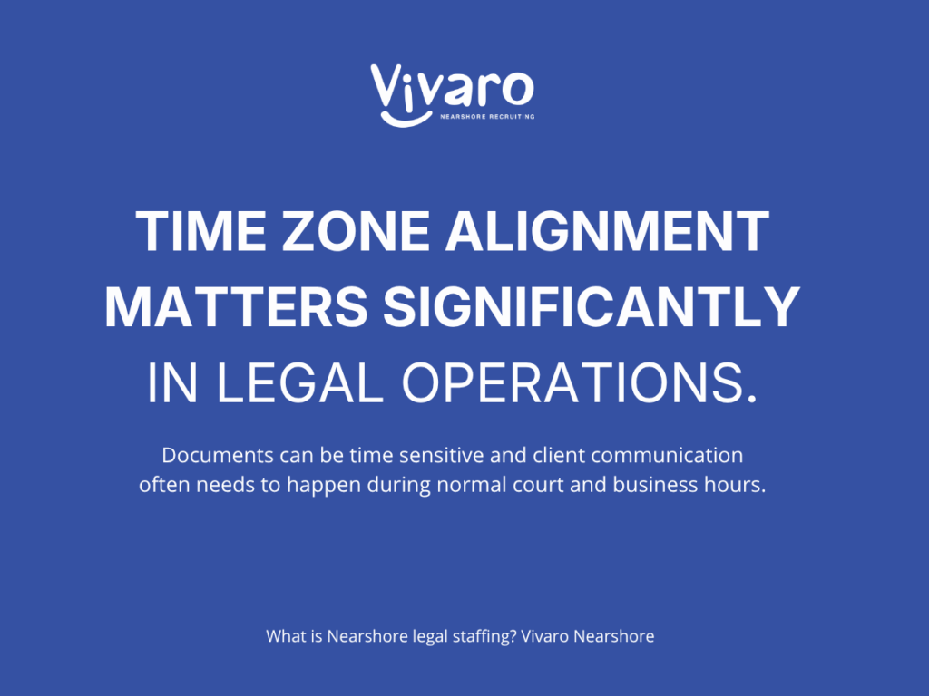 For U.S. law firms, common nearshore regions include Mexico, Canada, and Central America, with Colombia often considered the furthest “nearshore” option. Time zone alignment matters significantly in legal operations, where documents can be time sensitive and client communication often needs to happen during normal court and business hours. Depending on the role a firm is hiring for, it is critical that nearshore employees are available when attorneys, clients, and courts are operating.